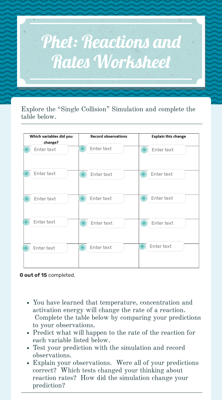 This lab uses the phet website simulation for rates and reactions reaction rates worksheet. This is why reaction rates vary greatly between different reactions.